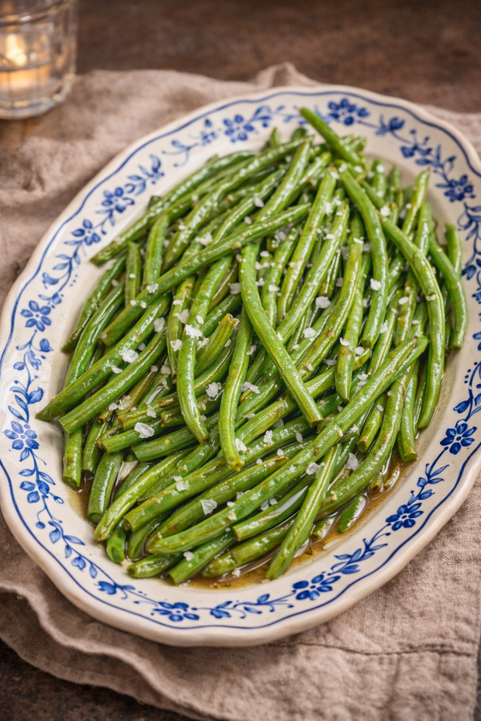 This is the kind of side dish that works with almost anything — roast chicken, steak, a simple piece of fish, or even just a bowl of rice. The beans stay bright and tender, coated in a light glaze and finished with flaky salt. It’s straightforward, familiar, and easy enough to make on an ordinary night.